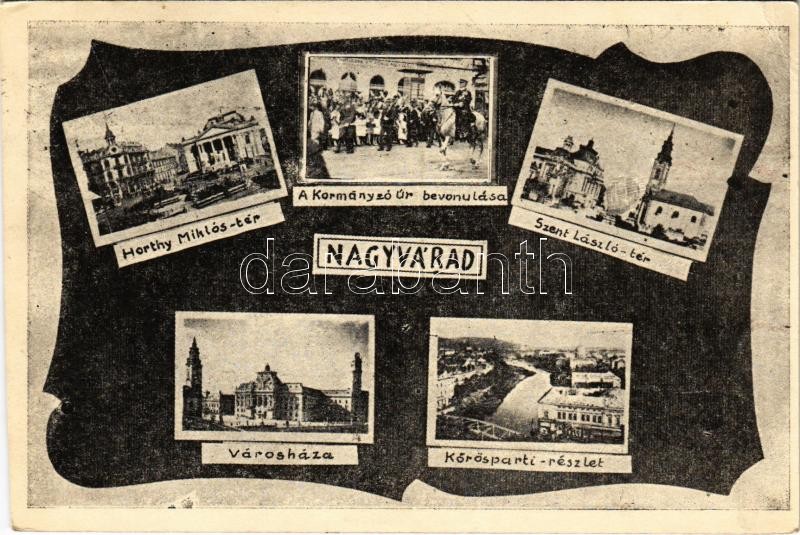 Nagyvárad, Oradea; Horthy Miklós tér, a Kormányzó úr bevonulása, Szent László tér, városháza, Kőrösparti részlet / entry of the Hungarian troops, Horthy, Cris riverside, town hall, square. Art Nouveau + "1940 Nagyvárad visszatért" So. Stpl (EK)