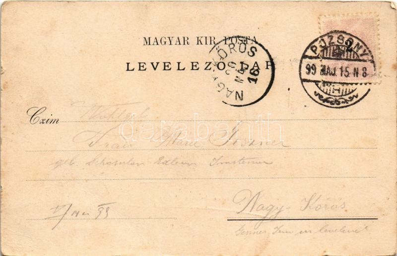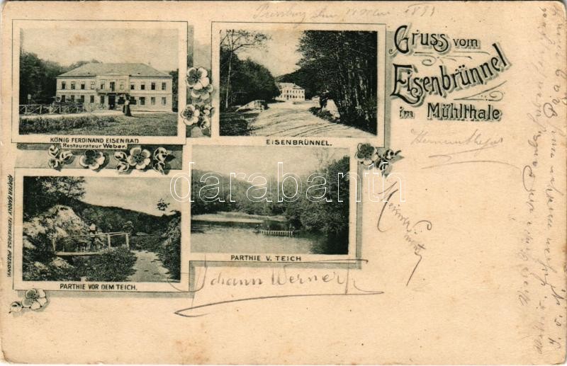 1899 Pozsony, Pressburg, Bratislava; Gruss vom Eisenbrünnel (Eisenbründl) im Mühlthale. König Ferdinand Eisenbad Restaurateur Weber, Eisenbrünnel, Partie vor dem Teich / Vaskutacska, Ferdinánd király vasfürdő, étterem, tó részlet. Körper Károly fényképész / Zelezná Studénka / spa, bath, restaurant, lake. Art Nouveau, floral (EB)