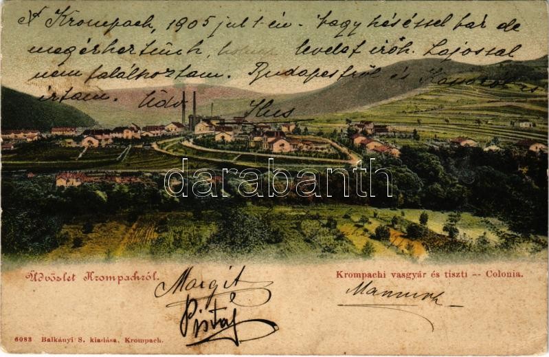 1905 Korompa, Krompach, Krompachy; vasgyár és tiszti kolónia. Balkányi... https://www.darabanth.com/de/407-Fernauktion/407.0/Ansichtskarten/Slowakei~1000006/1905-Korompa-Krompach-Krompachy-vasgyar-es-tiszti-kolonia-Balkanyi-S-kiadasa-iron-works-~II2520548
