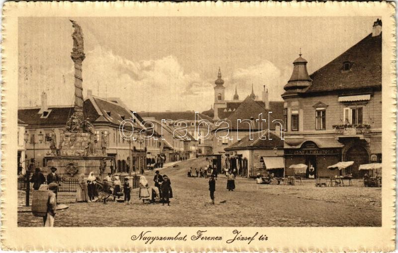 Beschreibung: 1913 Nagyszombat, Tyrnau, Trnava; Ferenc József tér, piac, Szentháromság szobor, Tausky J. fiai utóda divatáru raktár üzlete / market square, shop, Trinity statue
