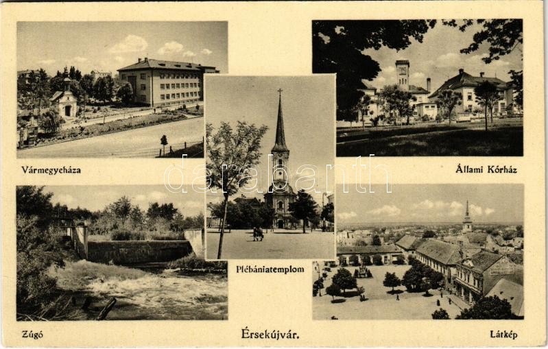Érsekújvár, Nové Zámky; Vármegyeháza, Állami kórház, Zúgó, Plébániatemplom, látkép. Peczár Károly kiadása / county hall, hospital, dam, church, general view
