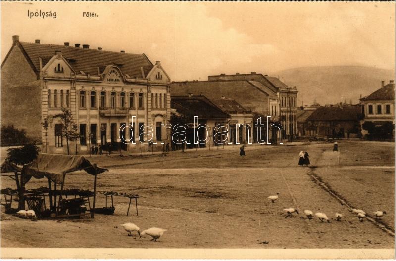 Ipolyság, Sahy; Fő tér, Lengyel szálloda, vendéglő és kávéház, Adler üzlete, piac / main square, hotel, restaurant and café, shops, market (képeslapfüzetből / from postcard booklet)