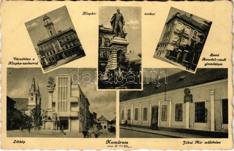 Komárom, Komárno; látkép, Városháza, Klapka szobor, Szent Benedek-rendi gimnázium, Jókai Mór szülőháza / general view, town hall, statue, high school, birthplace of Jókai (EK)