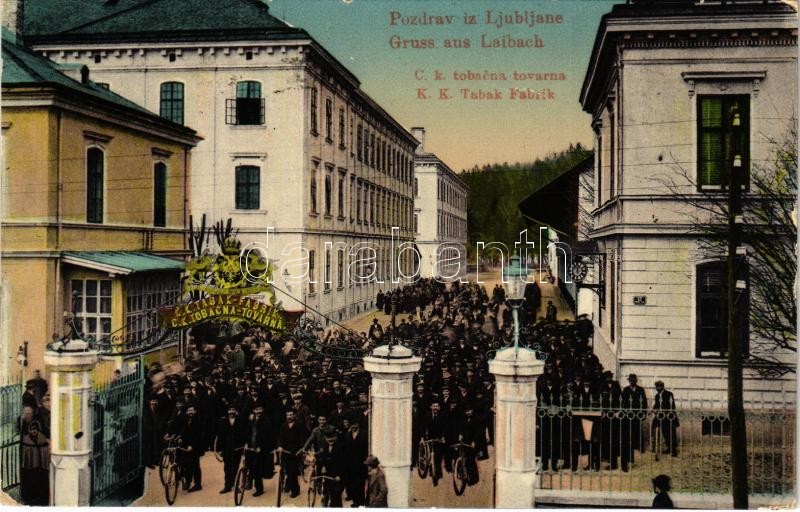 1915 Ljubljana, Laibach; K.K. Tabak Fabrik / C. k. tobacna tovarna / dohánygyár / tobacco factory, workers with bicycles. Franc Kunc Fotograf + "K.u.K. Reserve-Spital in Laibach" (EK)