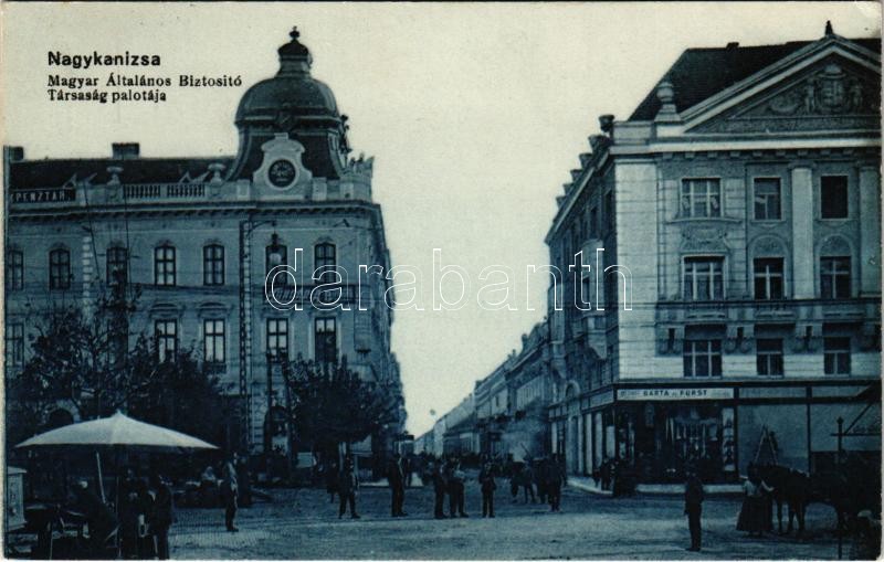 Beschreibung: 1917 Nagykanizsa, Csengeri út, Magyar Általános Biztosító Társaság palotája, Hungária Biztosító, Barta és Fürst üzlete, piac