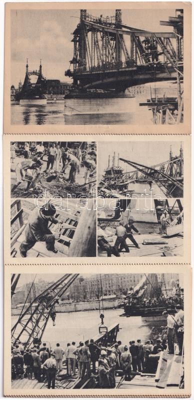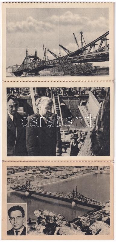 Beschreibung: 1945 Budapest, felrobbantott Ferenc József híd és az újjáépítése munkálatok, a kész Szabadság híd, Gerő Ernő és Tildy Zoltán - képeslapfüzet 6 képeslappal