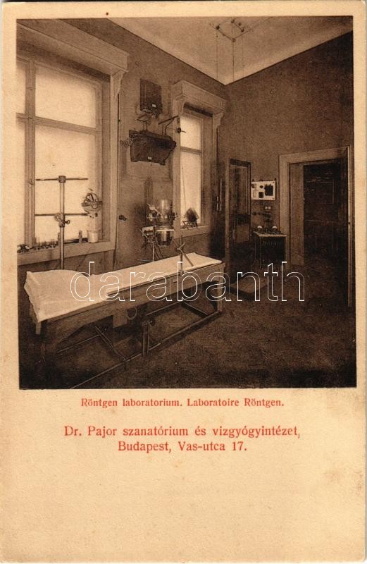 Budapest VIII. Dr. Pajor szanatórium és vízgyógyintézet, röntgen laboratórium, belső. Id. Weinwurm Antal kiadása. Vas utca 17. (ázott sarok / wet corner)