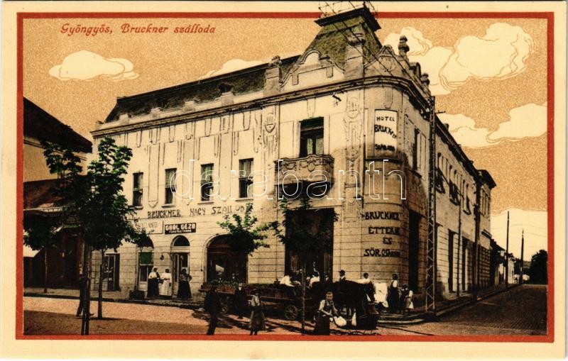 Gyöngyös, Bruckner szálloda, étterem és sörcsarnok, Gaál Géza fodrász ... https://www.darabanth.com/de/407-Fernauktion/407.0/Ansichtskarten/Ungarn~1000004/Gyongyos-Bruckner-szalloda-etterem-es-sorcsarnok-Gaal-Geza-fodrasz-terme-Kientzl-Nando~II2514294