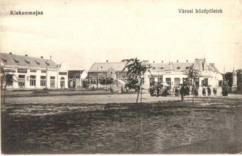 Beschreibung: Kiskunmajsa, Városi középületek, Bazár, Bank, Duna Biztosító fiókja, üzletek, árusok (EK)