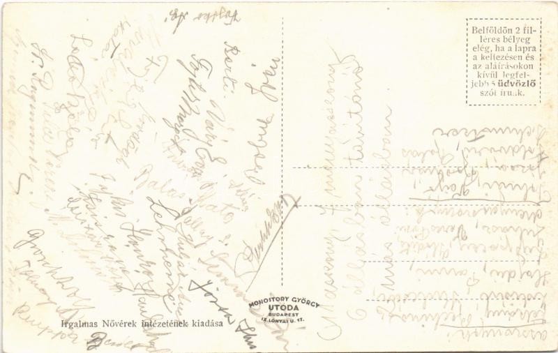 Beschreibung: Miskolc, Irgalmas Nővérek érseki leány nevelőintézete, leányinternátus. Hátoldalon dolgozók aláírása