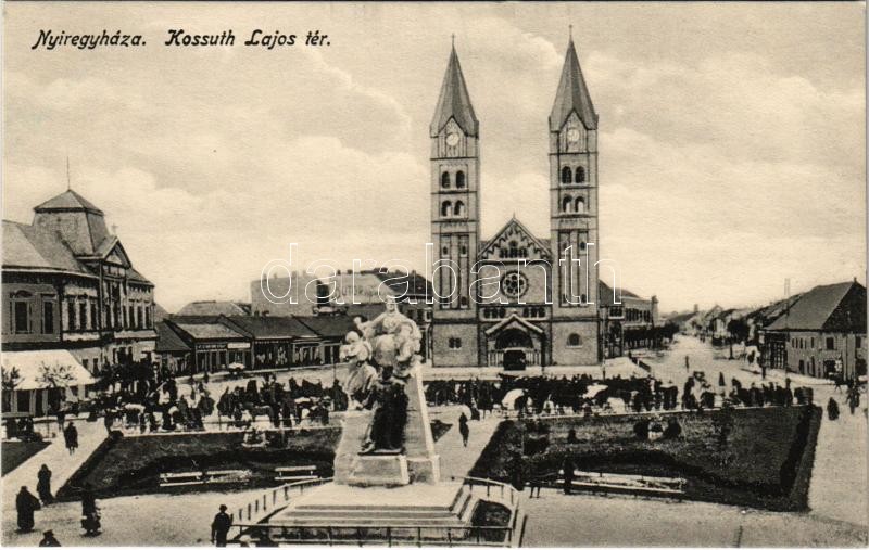 Beschreibung: Nyíregyháza, Kossuth Lajos tér és szobor, piac, üzletek, templom. Szántó Ernő kiadása
