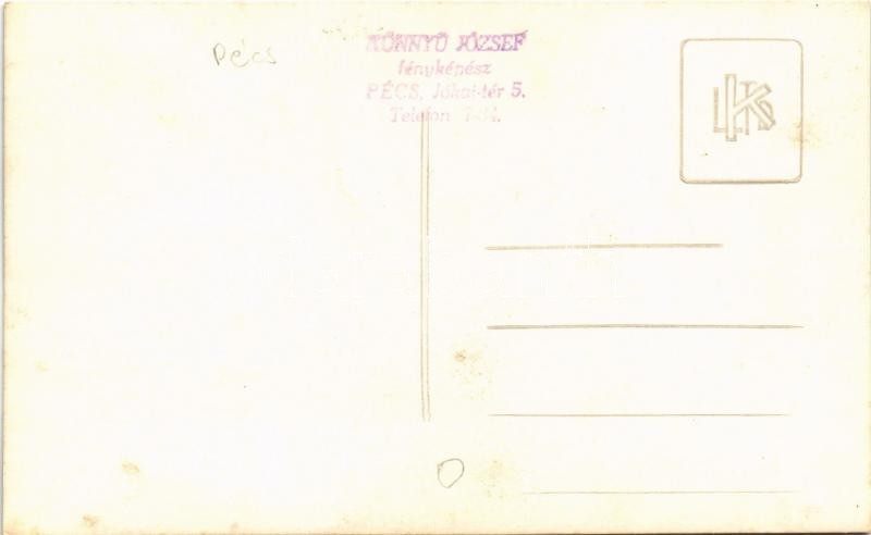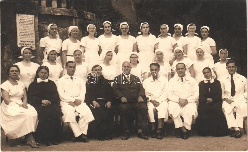 Beschreibung: Pécs, kórházi csoportkép nővérekkel, orvosokkal és pappal, kórházi tábla. Könnyű József fényképész, Pécs, Jókai tér 5. photo