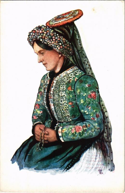 Beschreibung: Szentistván, Matyó menyecske, magyar folklór művészlap s: Csikós Tóth András