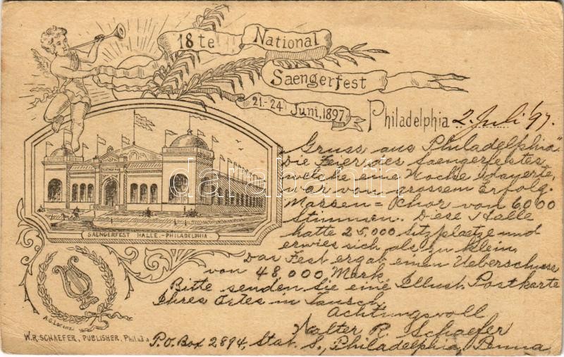 1897 (Vorläufer!) Philadelphia (Pennsylvania), 18te National Saengerfest 21-24. Juni 1897 / 18th National Sängerfest (singer festival) held in Philadelphia, singing competition advertisement card. W. R. Schaefer Publisher. A. G. Lorenz. Art Nouveau, floral (fa)