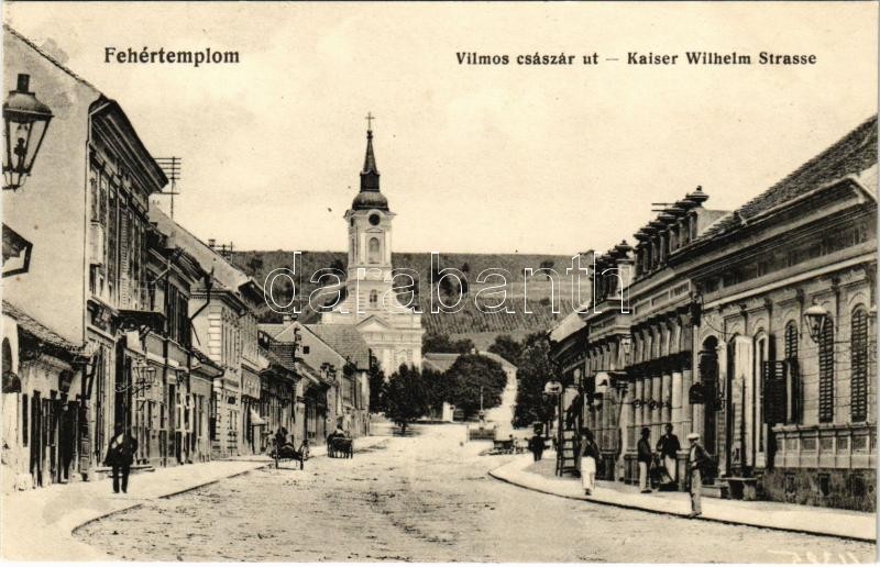 Fehértemplom, Ung. Weisskirchen, Bela Crkva; Vilmos császár út, templom, üzletek. Hepke Berthold kiadása / Kaiser Wilhelm Strasse / street view, church, shops
