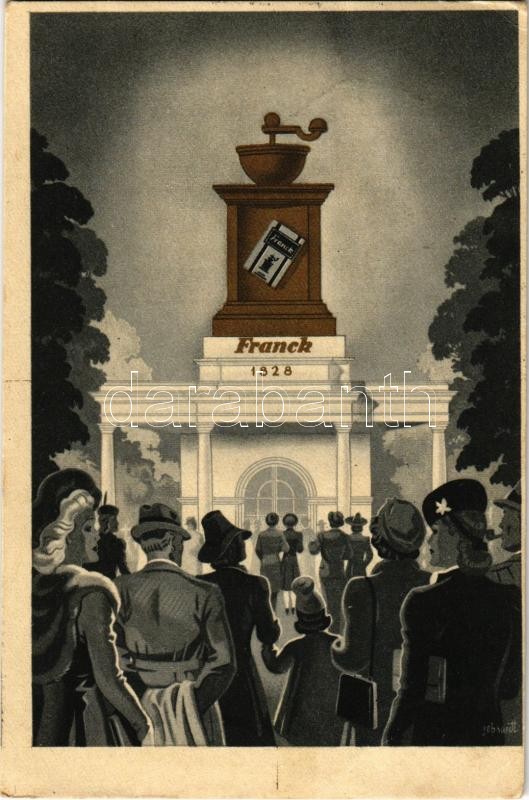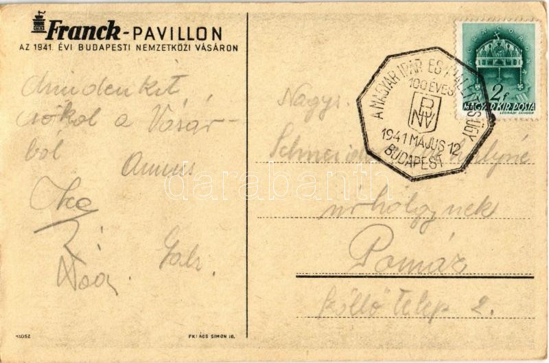 Franck kávé pavilonja az 1941. évi Budapesti Nemzetközi Vásáron, reklámlap. Klösz / Hungarian coffee advertisement s: Gebhardt + " 100 éves a Magyar Ipar és Kiállításügy 1941. május 12. Budapest" So. Stpl. (EB)