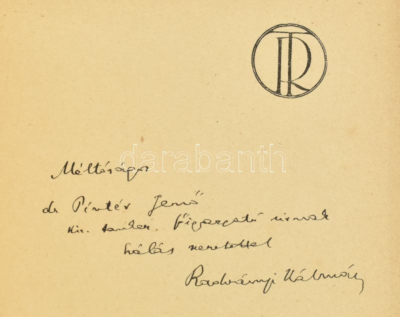 Dixon, Franklin W.: Az óceánrepülő. Ford.: Radványi Kálmán. Márton Lajos rajzaival. Bp., é.n., Révai. Kiadói aranyozott egészvászon-kötés, kissé sérült borítóval és gerinccel, helyenként kissé foltos lapokkal. A fordító, Radványi Kálmán (1887-1943) által Pintér Jenő (1881-1940) irodalomtörténész, a budapesti tankerület főigazgatója részére DEDIKÁLT példány.