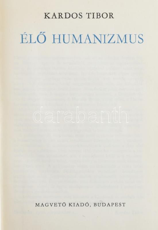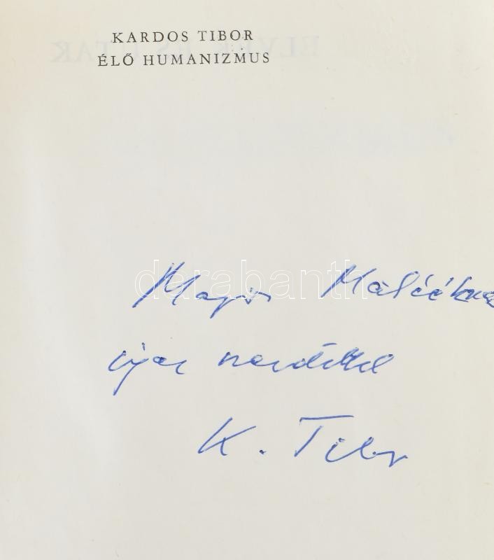 Kardos Tibor: Élő humanizmus. Irodalmi tanulmányok, arcképek, vázlatok. Elvek és Utak. Bp.,1972,Magvető. Kiadói egészvászon-kötés, kiadói papír védőborítóban. A szerző, Kardos Tibor (1908-1973) Kossuth-díjas irodalomtörténész, filológus, műfordító által Major Máté (1904-1986) Kossuth-díjas építész részére dedikált példány.