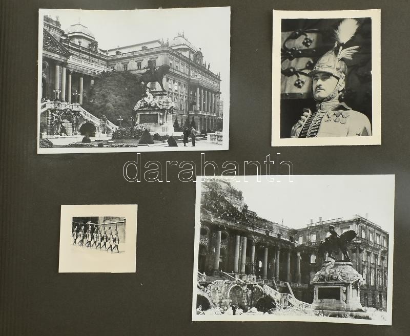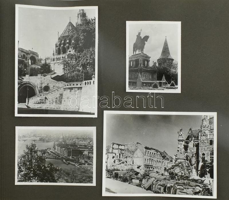cca 1940-1950 "Ilyen volt, ilyen lett." Budapest az ostrom előtt, és az ostrom után, fotóalbum, 45 beragasztott fotó, benne későbbi előhívásokkal is, kissé kopott haránt alakú, fűzött vászon fotóalbumban, 18x12,5 cm és 4,5x4,5 cm