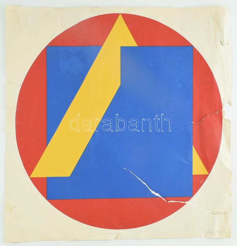 Beschreibung: Fajó János (1937-2018): Kompozíció (cím nélkül), 1986. Szitanyomat, papír. Jelzett. Sérült, szakadt, hiányos, foltos. Lapméret: 56x56 cm.