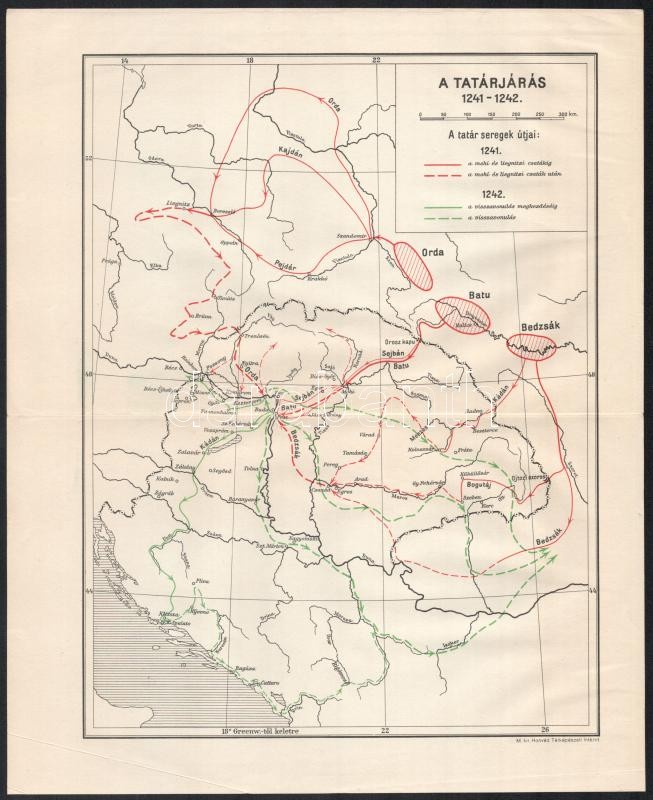 Beschreibung: A tatárjárás 1241-1242, a tatár seregek útjai, M. kir. Honvéd Térképészeti Intézet, 29×23,5 cm