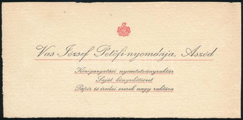 Vas József Petőfi-nyomdája Aszód reklámkártya https://www.darabanth.com/de/407-Fernauktion/407.0/Kunst-Dokumente-andere-Sammelgebiete/Werbungen~22/Vas-Jozsef-Petofi-nyomdaja-Aszod-reklamkartya~II2517485
