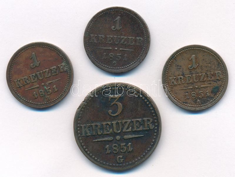 1851B 1kr Cu + 1851G 1kr Cu + 1851G 1kr Cu + Ausztria 1851A 1kr Cu T:2... https://www.darabanth.com/de/407-Fernauktion/407.0/Numismatik/Ungarische-Munzen-und-Munzen-mit-ungarischem-Munzzeichen~1500001/1851B-1kr-Cu-plus-1851G-1kr-Cu-plus-1851G-1kr-Cu-plus-Ausztria-1851A-1kr-Cu-T2-3~II2519391