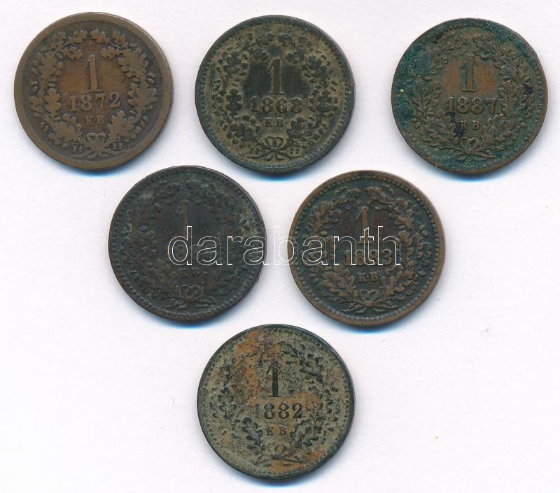 1868-1887. 1kr Cu "Angyalos-címer" "Középcímer" (6xklf) T:2-,3 https://www.darabanth.com/de/407-Fernauktion/407.0/Numismatik/Ungarische-Munzen-und-Munzen-mit-ungarischem-Munzzeichen~1500001/1868-1887-1kr-Cu-Angyalos-cimer-Kozepcimer-6xklf-T2-3~II2519340