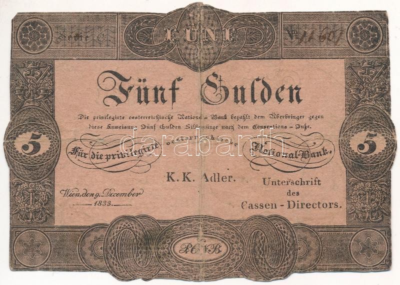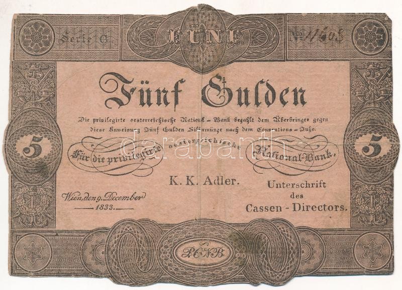 Ausztria 1833. 5G "11601" vízjeles papíron, körbevágva T:IV https://www.darabanth.com/de/407-Fernauktion/407.0/Numismatik/Weltweit-Banknoten~1500022/Ausztria-1833-5G-11601-vizjeles-papiron-korbevagva-TIV~II2520348
