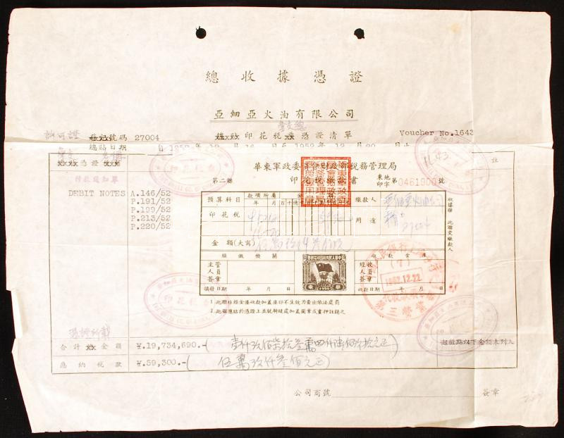 Beschreibung: Kínai Népköztársaság 1952 okmány benyomott illetékbélyeggel