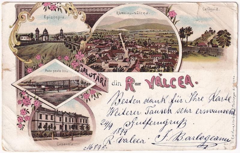1899 Ramnicu Valcea, Episcopia, Cetatuia, Podu peste Oltu, Casarma. Editura Librariei O. Thüringer / episcopate, fortress, bridge, military barracks. Art Nouveau, floral, litho (b)