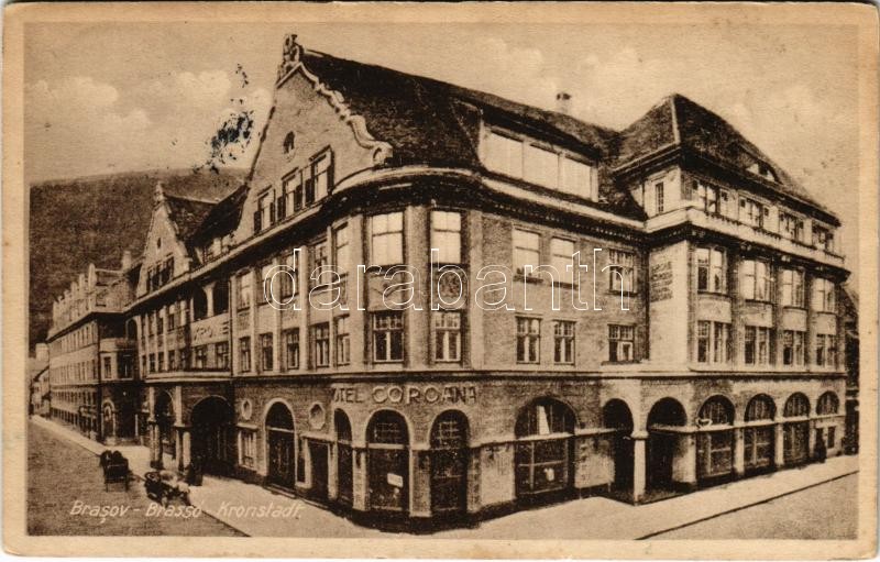1930 Brassó, Kronstadt, Brasov; Korona szálloda / Hotel Coroana https://www.darabanth.com/de/408-Fernauktion/408.0/Ansichtskarten/Siebenburgen~1500006/1930-Brasso-Kronstadt-Brasov-Korona-szalloda-Hotel-Coroana~II2529150