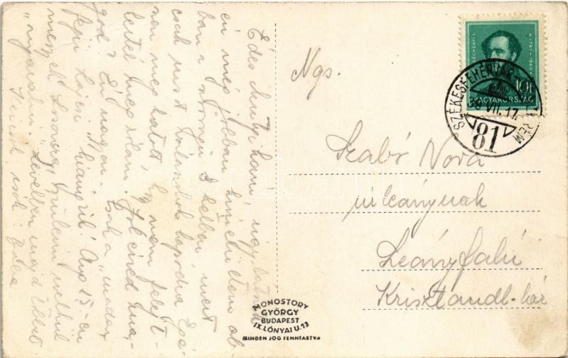 Beschreibung: 1939 Érd, Érd-kertváros, kaszinó, Országzászló, KATSz telepi strand + "SZÉKESFEHÉRVÁR - VESZPRÉM 81" vasúti mozgóposta bélyegző (EK)