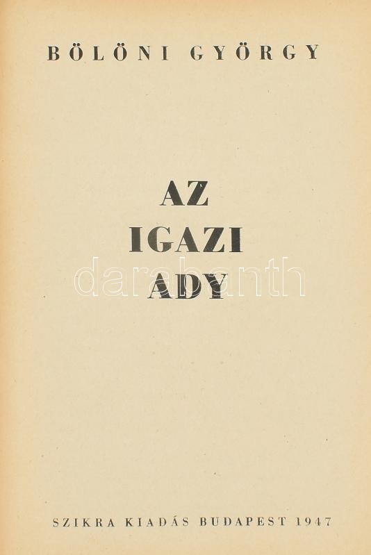 Bölöni György: Az igazi Ady. A borító illusztrációja Pór Bertalan munkája. A párizsi fotókat André Kertész készítette. A Magyar Könyvnapokra készült kiadvány. Bp.,1947, Szikra, 403 p.+24 t.(Kétoldalas fekete-fehér fotók.) Kiadói félvászon kötésben