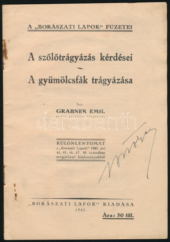 Grabner Emil: A szőlőtrágyázás kérdései. A gyümölcsfák trágyázása. A "Borászati Lapok" füzetei. (Bp.), 1941, Borászati Lapok, 22 p. Kiadói tűzött papírkötés, kissé sérült, foltos borítóval.