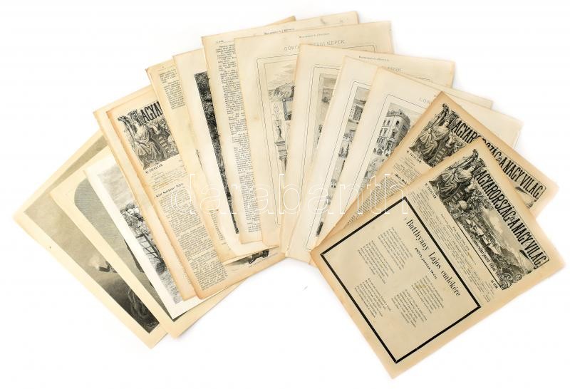 cca 1870-1875 Vegyes fametszet tétel újságkivágásokon, (In: Magyarország és a Nagyvilág), közte oláh czigány, oláh czigányasszony, athleták akadály-versenye, a jelen háború intézői (rajta Bismarck, a porosz király, Károly Frigyes herceg és mások), gróf Széchényi Ödön, londoni képek I-II., görögországi és konstantinápolyi képek, Margitsziget (Alsó vendéglő, A főherczegi nyári lak, Szeretetház Balaton-füreden, Oroszlánvadászat, indulás a vadászatra, Batthyány Lajos özvegye), összesen 15 metszet 14 lapon, + "Batthyány Lajos emlékére 1870. jun. 9-én." emlékverssel címlapkivágáson, különféle méretben, változó állapotban, egy lapszélen kis szakadásokkal, de alapvetően jó állapotban, lapméret: 39x28 cm