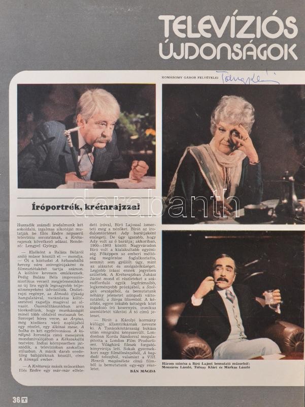 Beschreibung: Tolnai Klári, Feleki Sári, Földi Teri, Kállay Ilona, Vass Éva színésznők aláírásai őket ábrázoló, róluk szóló újságlapokon