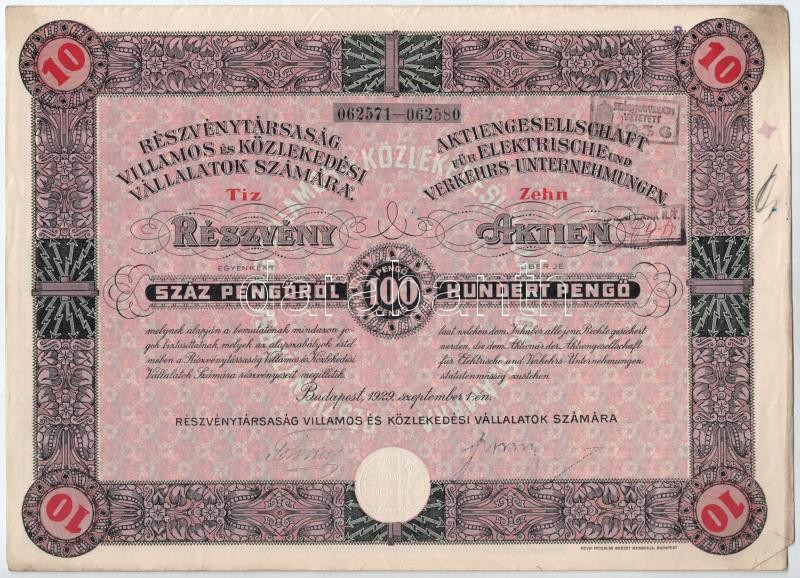 Budapest 1929. "Részvénytársaság Villamos és Közlekedési Vállalatok Számára" tíz részvénye 100P-ről, szelvényekkel, bélyegzéssel és szárazpecséttel T:III