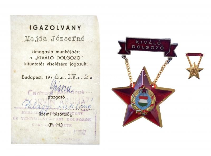 Beschreibung: 1976. "Kiváló Dolgozó" aranyozott, zománcozott fém kitüntetés miniatűrrel, eredeti tokban, igazolvánnyal T:2 ragasztás elengedett
