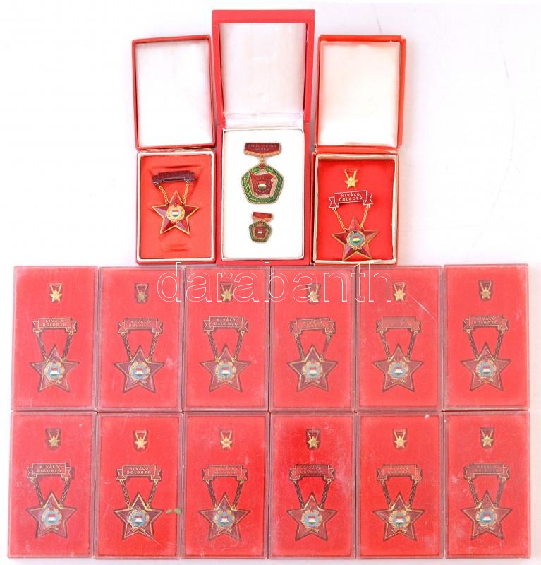 ~1970. 14db "Kiváló Dolgozó" kitüntetés, egy kivétellel mindegyik miniatűrrel, mindegyik eredeti tokban (némelyik tok sérült) + "A Vállalat Kiváló Brigádja - Szocialista Brigád" bronz fokozatú fém jelvény miniatűrrel, eredeti tokban T:1-2