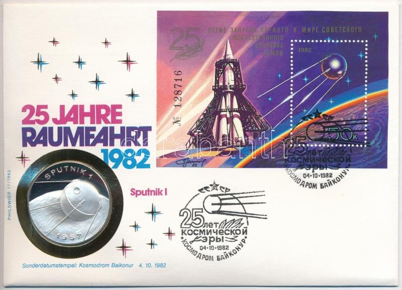 Switzerland 1982. "Sputnik 1957 / 1982 25 jahre Raumfahrt" hallmarked Ag commemorative medallion in coin envelope, with Soviet stamp and cancellation (0.999) C:PP patina on reverse