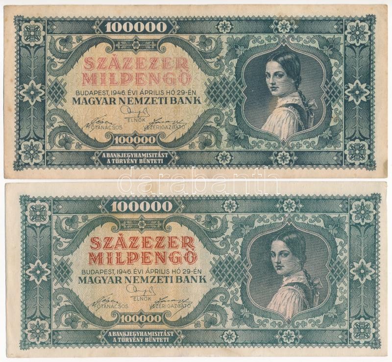 1946. 100.000MP (2db, eltérő színváltozatok, egyiknél kis nyomateltoló... https://www.darabanth.com/de/408-Fernauktion/408.0/Numismatik/Ungarische-Banknoten~2000007/1946-100000MP-2db-eltero-szinvaltozatok-egyiknel-kis-nyomateltolodas-TIII-Adamo-P30~II2527652