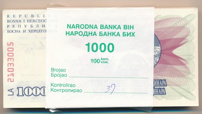 Bosznia-Hercegovina 1992. 1000D (95x) eredeti, de sérült banki kötegelővel, sorszámkövetők T:I-II