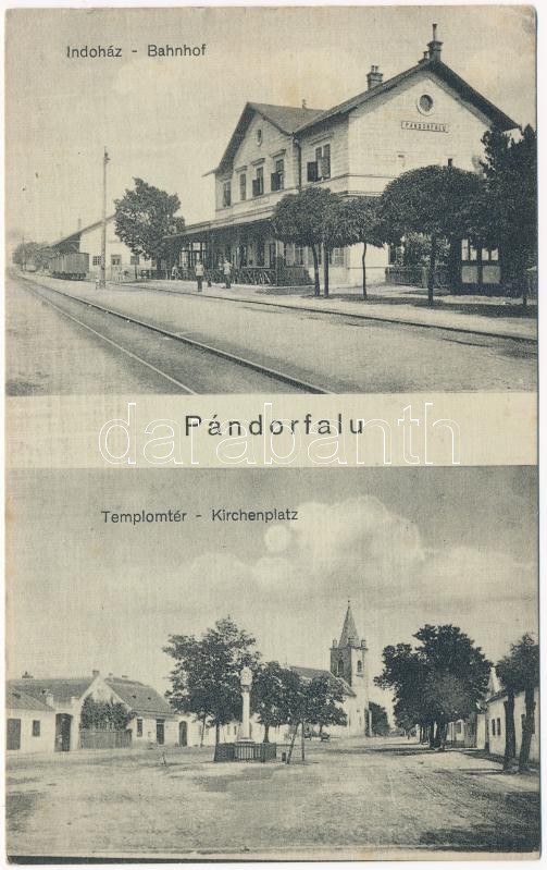 Beschreibung: 1915 Pándorfalu, Parndorf; indóház, vasútállomás, templom tér / Bahnhof, Kirchenplatz / railway station, church square (fa)