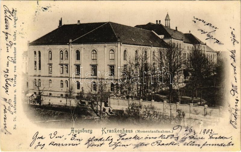 1902 Augsburg, Krankenhaus (Momentanaufnahme) / hospital. Aufnahme u. ... https://www.darabanth.com/de/409-Fernauktion/409.0/Ansichtskarten/Deutschland~1000053/1902-Augsburg-Krankenhaus-Momentanaufnahme-hospital-Aufnahme-u-Verlag-v-Kutscher-Gehr~II2542886