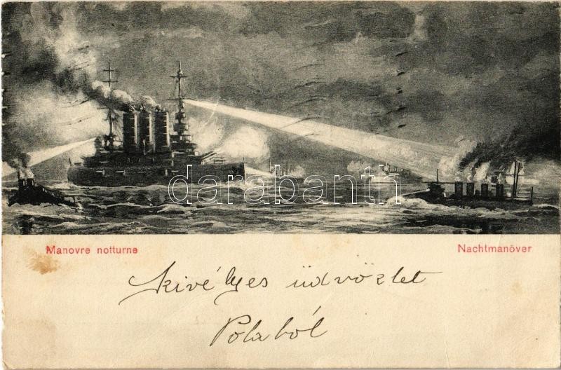 1910 Manovre notturne / Nachtmanöver. Schlachtschiff Eh. Friedrich, Torpedoboot / Osztrák-Magyar Haditengerészet SMS Erzherzog Friedrich pre-dreadnought (Linienschiffe) csatahajója és torpedónaszádja éjszakai manőveren / Austro-Hungarian Navy K.u.K. Kriegsmarine, SMS Erzherzog Friedrich pre-dreadnought battleship and torpedo boat on night maneuver. G. Costalunga, Pola 1909. (fl)