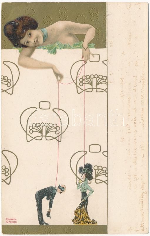1904 "Marionettes" Art Nouveau, litho s: Raphael Kirchner (f... https://www.darabanth.com/de/409-Fernauktion/409.0/Ansichtskarten/Kunstlerkarten~1000067/1904-Marionettes-Art-Nouveau-litho-s-Raphael-Kirchner-feluleti-serules-surface-damage~II2540210