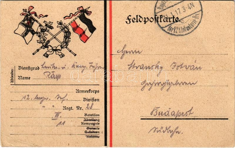 1917 Feldpostkarte / WWI German military field postcard, German flags ... https://www.darabanth.com/de/409-Fernauktion/409.0/Ansichtskarten/Militaria~1000057/1917-Feldpostkarte-WWI-German-military-field-postcard-German-flags-EK~II2159272