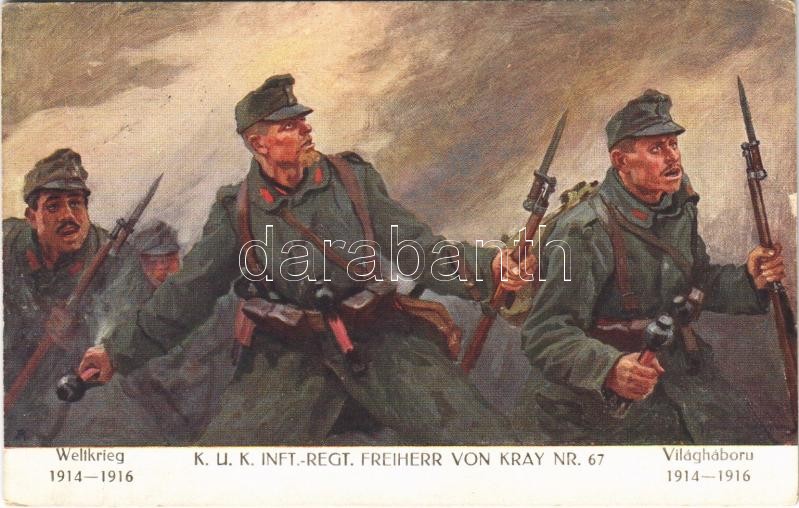 1917 Weltkrieg 1914-1916 - K.u.K. Inft.-Regt. Freiherr von Kray Nr. 67. Verlag K.u.K. Kmdo. der 27. Inf. Trp. Dion. / WWI Austro-Hungarian military art postcard, support fund, infantry regiment s: Hans Larwin (EK)