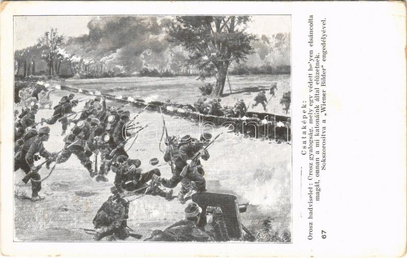 Csataképek. Orosz hadviselet: Orosz gyalogság, mely egy védett helyen elsáncolta magát, onnan a mi katonáink által elűzetnek / WWI Austro-Hungarian K.u.K. military art postcard. Wiener Rotophot (EK)